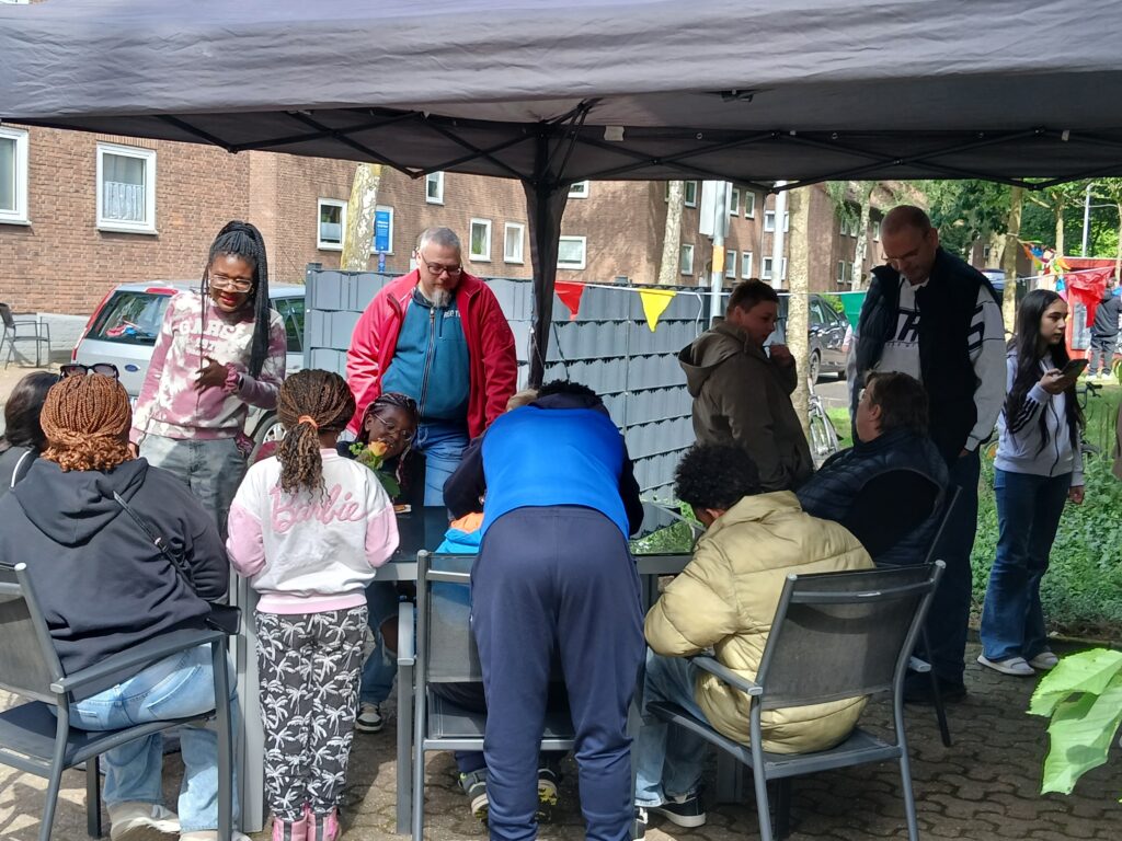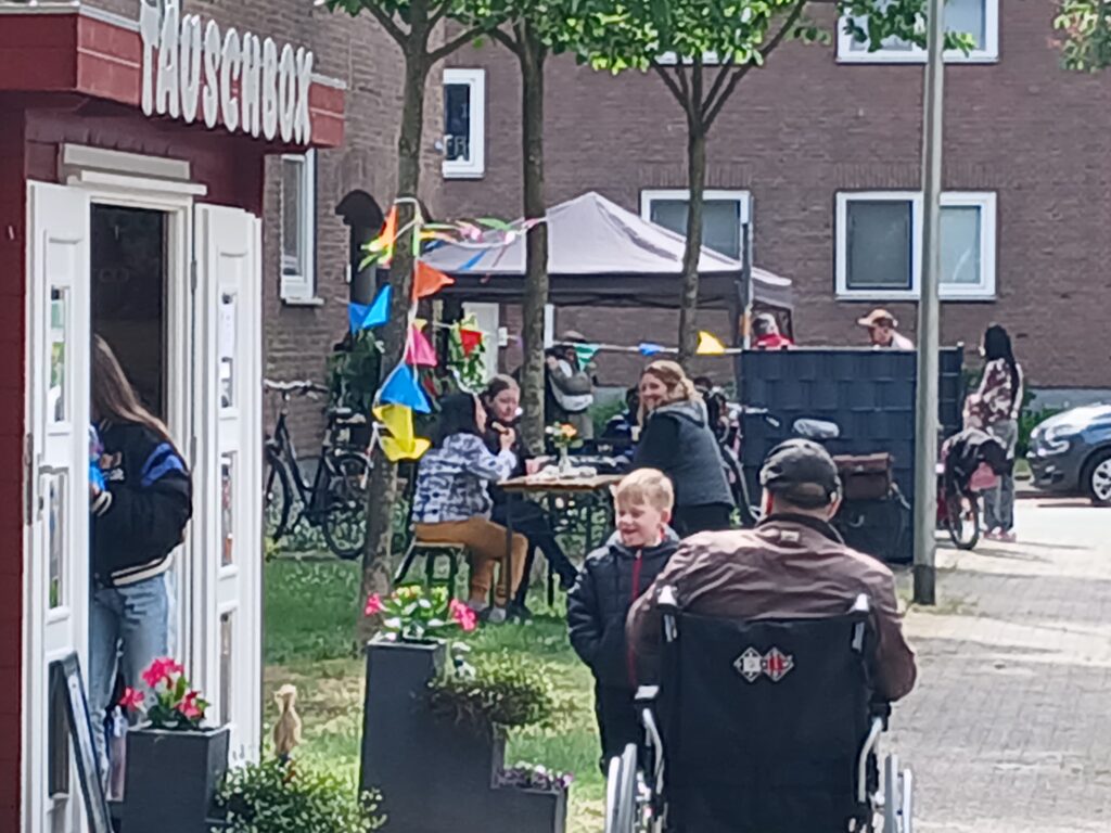 Zum Tag der Nachbarschaft am 23. Mai 2025 gab es an der Tauschbox ein Fest, zu dem mehr als 60 Gäste kamen. In den Tagen zuvor hatten Ehrenamtliche ansprechend gestaltete Einladungskarten in die Briefkästen des Viertels geworfen. „In gemütlicher Atmosphäre mit Getränken, Kaffee und frischen Waffeln lernen wir unsere Nachbarn kennen. Kommt vorbei, wir freuen uns auf euch“, hieß es darauf.
